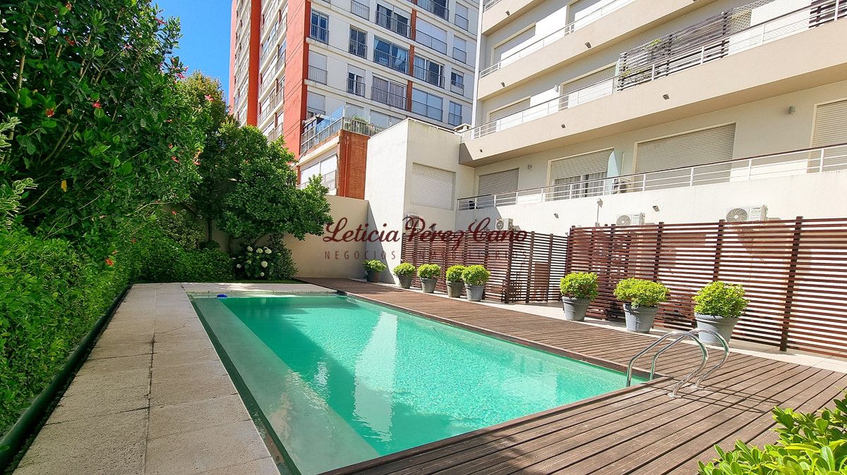 Living comedor con salida al balcón, amplios ventanales., cocina definida con salida a un patio interior con parrillero propio, 3 dormitorios, 3 baños (2 en suite), desde 2 de los dormitorios se accede a otro patio que da a la piscina del edificio.
