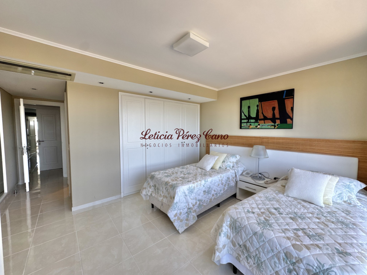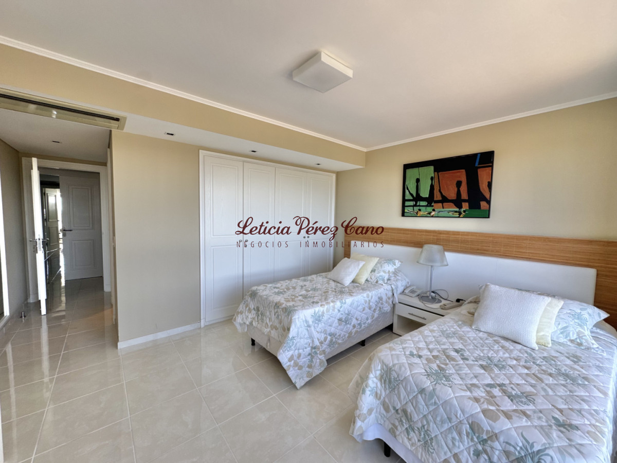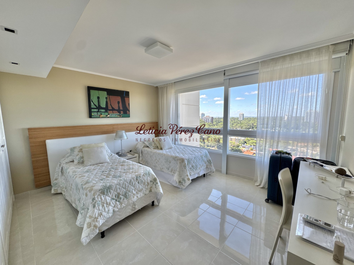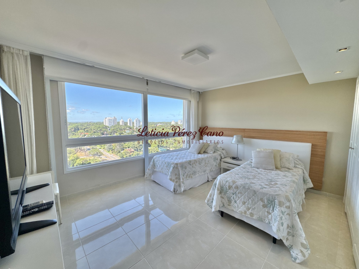 Unidad esquinera en piso alto con vista hacia Punta Ballena, del para disfrutar de los mejores atardeceres de Punta del Este. Living comedor Luminosas y amplio con salida al balcón para disfrutar de las mejores vistas de Punta del Este hacia la Isla Gorriti. Cocina definida con comedor diario y entrada de de servicio. Tres dormitorios en suite, principal con vestidor. Dependencia de servicios y toilette.