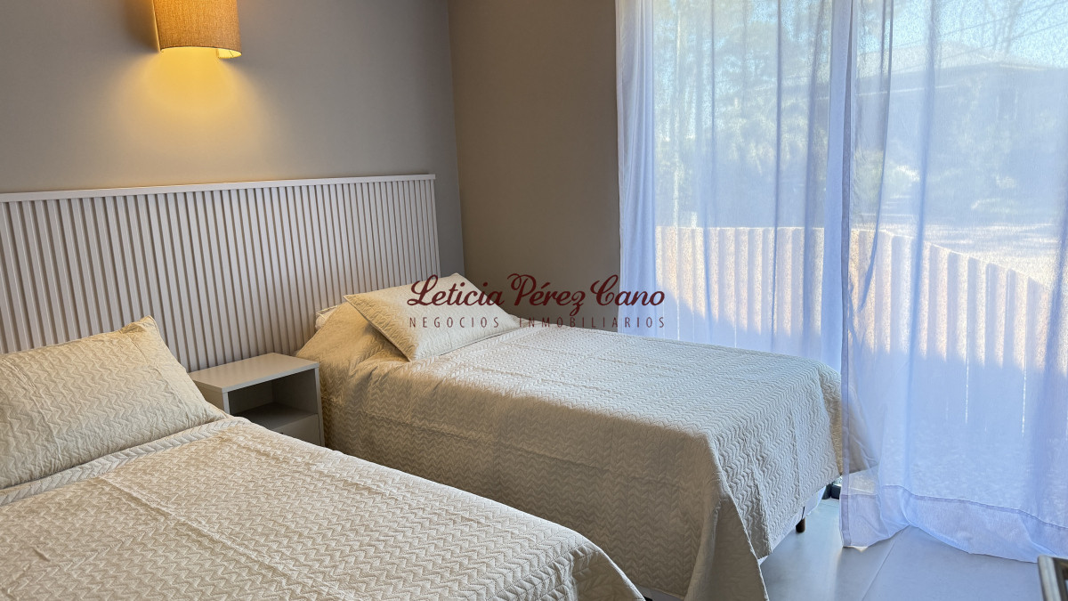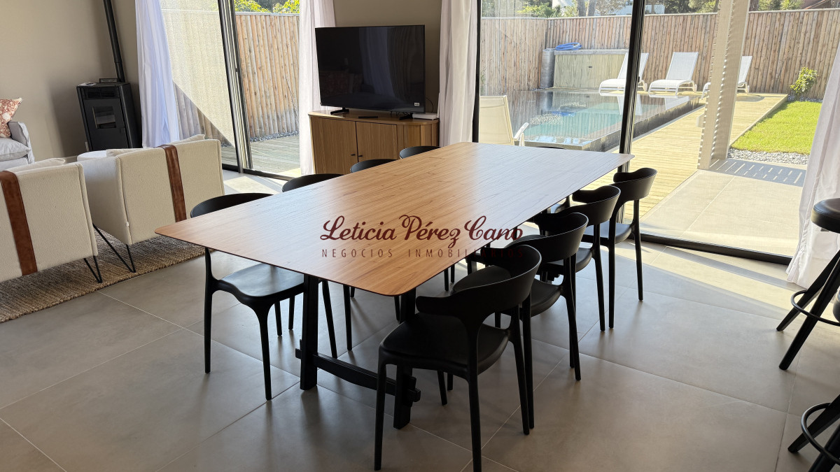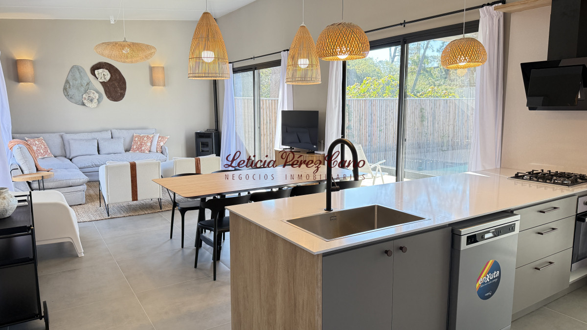 Living comedor con cocina integrada, 3 dormitorios , 2 baños (principal en suite), parrilla techada con toilette, piscina, jardin cercado, estacionamiento.